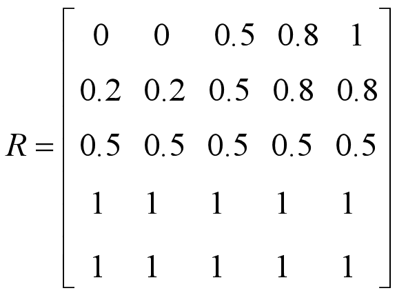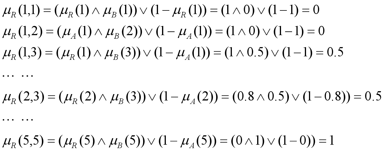 可以看出, 模糊命题中描述事物属性、状态和关系的语词, 就是这里的语言值。这些语言值许多都可用模糊集合表示。我们知道,一条规则实际是表达了前提中的语言值与结论中的语言值之间的对应关系(如上例中的规则就表示了语言值“小”与“大”的对应关系)。现在语言值又可用集合表示, 所以, 一条模糊规则实际就刻划了其前提中的模糊集与结论中的模糊集之间的一种对应关系。Zadeh认为, 这种对应关系是两个集合间的一种模糊关系, 因而它也可以表示为模糊集合。于是, 一条模糊规则就转换成了一个模糊集合。特别地, 对于有限集, 则就是一个模糊矩阵。