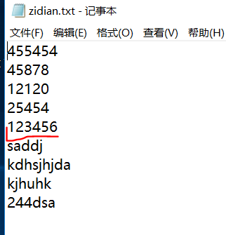 接下来我们在zidian.text文件中编写我们的密码字典,每一行一个密码,红色部分是我们的正确密码