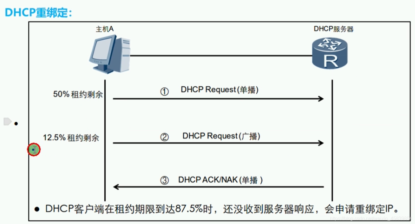 DHCP客户端在租约期限到达87.5%时,还没收到服务器响应,会申请重绑定IP。