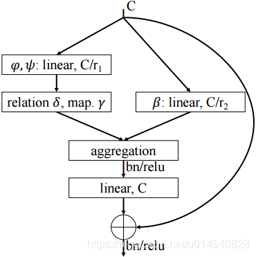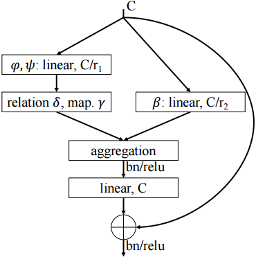 The self-attention operations described in Sections 3.1 and 3.2 can be used to construct residual blocks [12] that perform both feature aggregation and feature transformation. Our self-attention block is illustrated in Figure 1. The input feature tensor (channel dimensionality