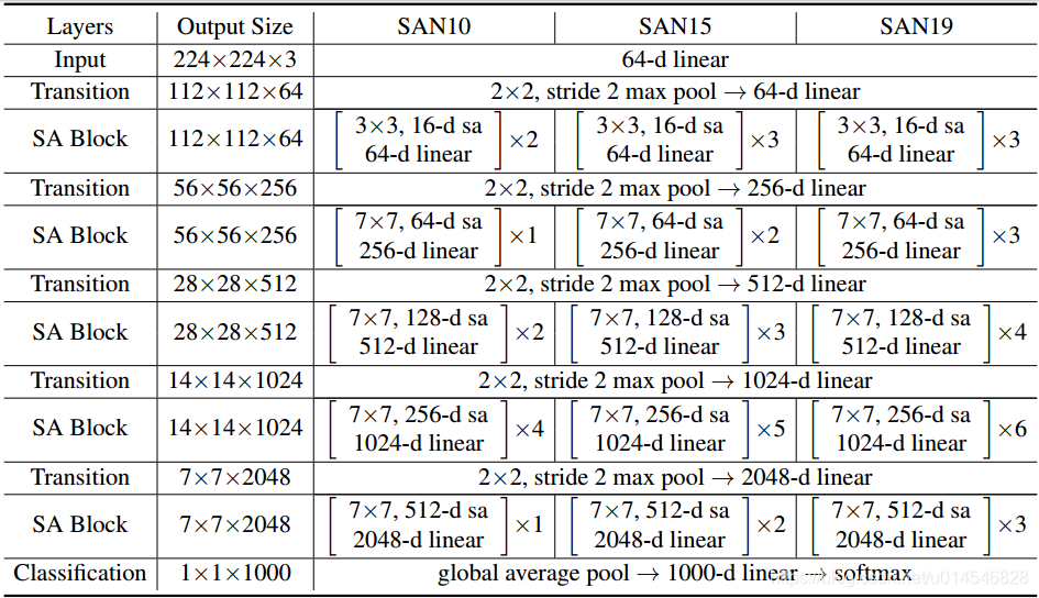 Table 1. Self-attention networks for image recognition. ‘C-d linear’ means that the output dimensionality of the linear layer is ‘C’. ‘C-d sa’ stands for a self-attention operation with output dimensionality ‘C’. SAN10, SAN15, and SAN19 are in rough correspondence with ResNet26, ResNet38, and ResNet50, respectively. The number X in SANX refers to the number of self-attention blocks. Our architectures are based fully on self-attention.