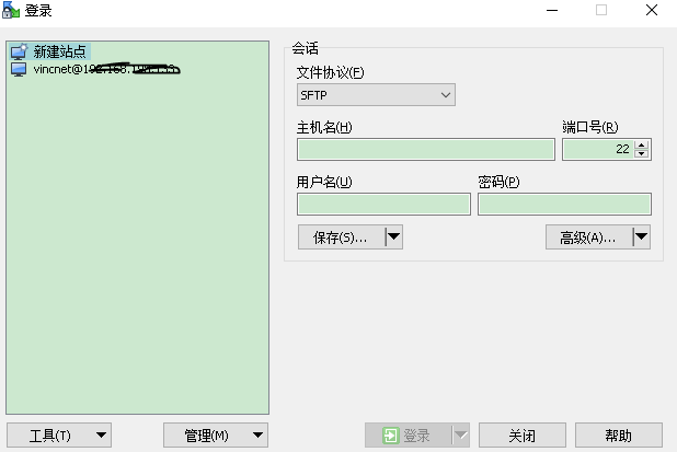 首先介绍站点的保存,在主界面左栏中,用于新建的站点配置和保存站点的显示。即点击“新建站点”,在右栏中配置文件协议、主机名、端口号、用户名、密码,保存后在左栏中显示。具体操作如下: