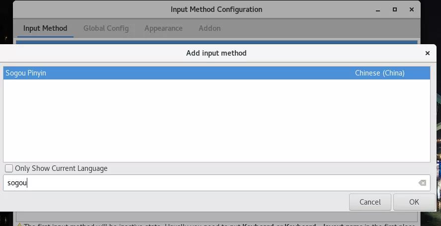 输入fcitx-configtool启动,添加键盘时取消勾选,输入sogou过滤,看到Sogou Pinyin输入法,点击添加进去,然后按SHIFT键切换输入法,测试中文输出即可