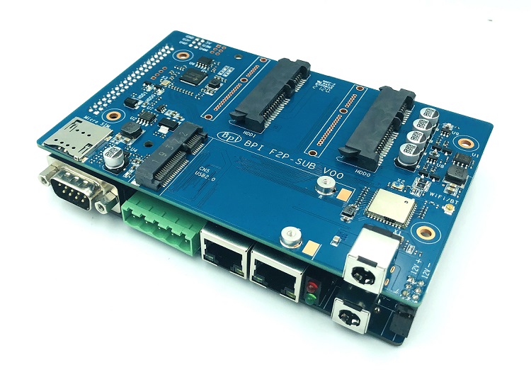 有了这个扩展板,可以让BPI-F2P 支持4G模块,完成4G联网功能,板上集成WIFI. 并支持两个SATA接口。