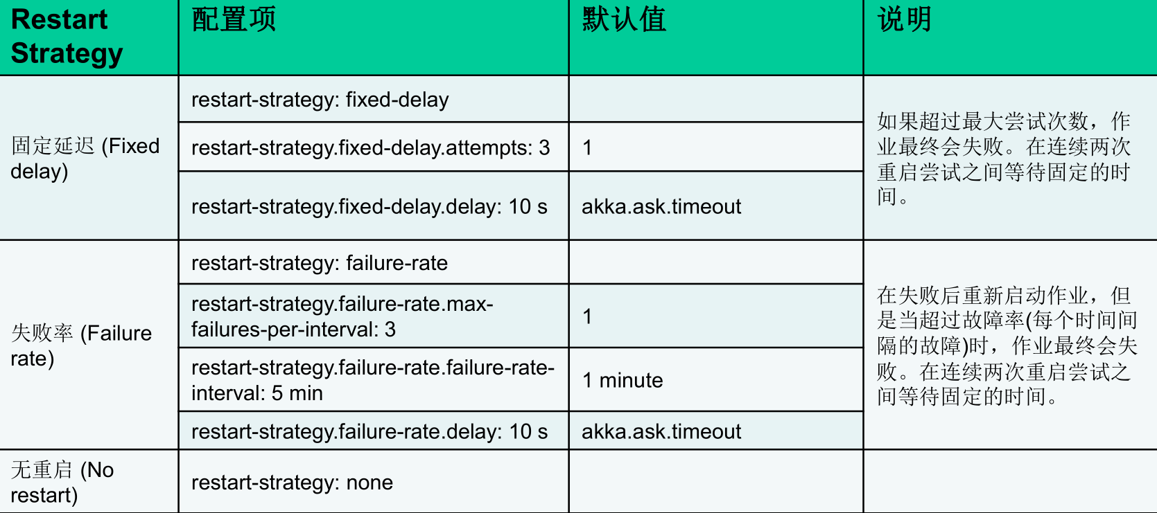| restart-strategy.failure-rate.delay | 两次连续重启尝试之间的延迟 | akka.ask.timeout |