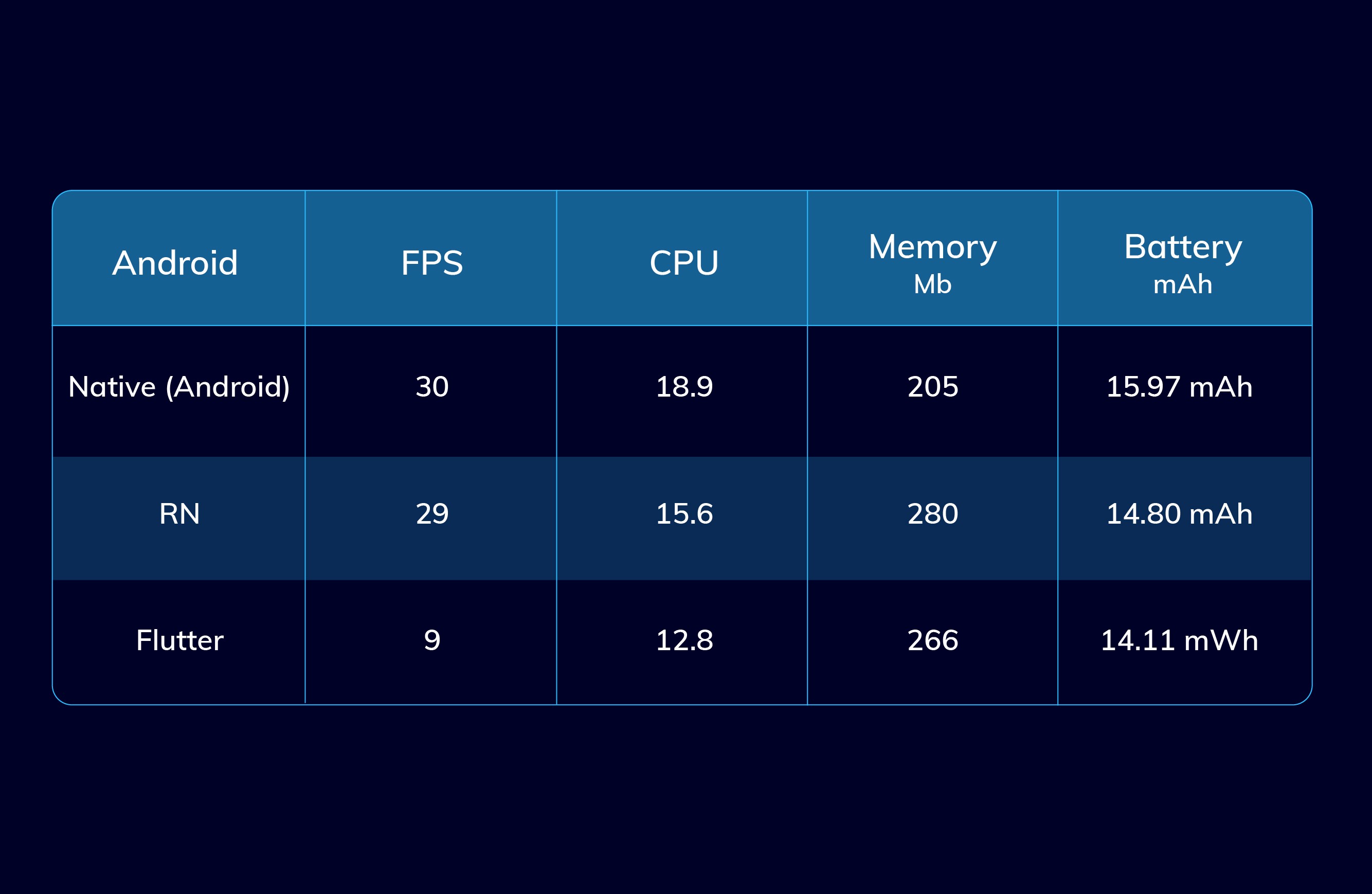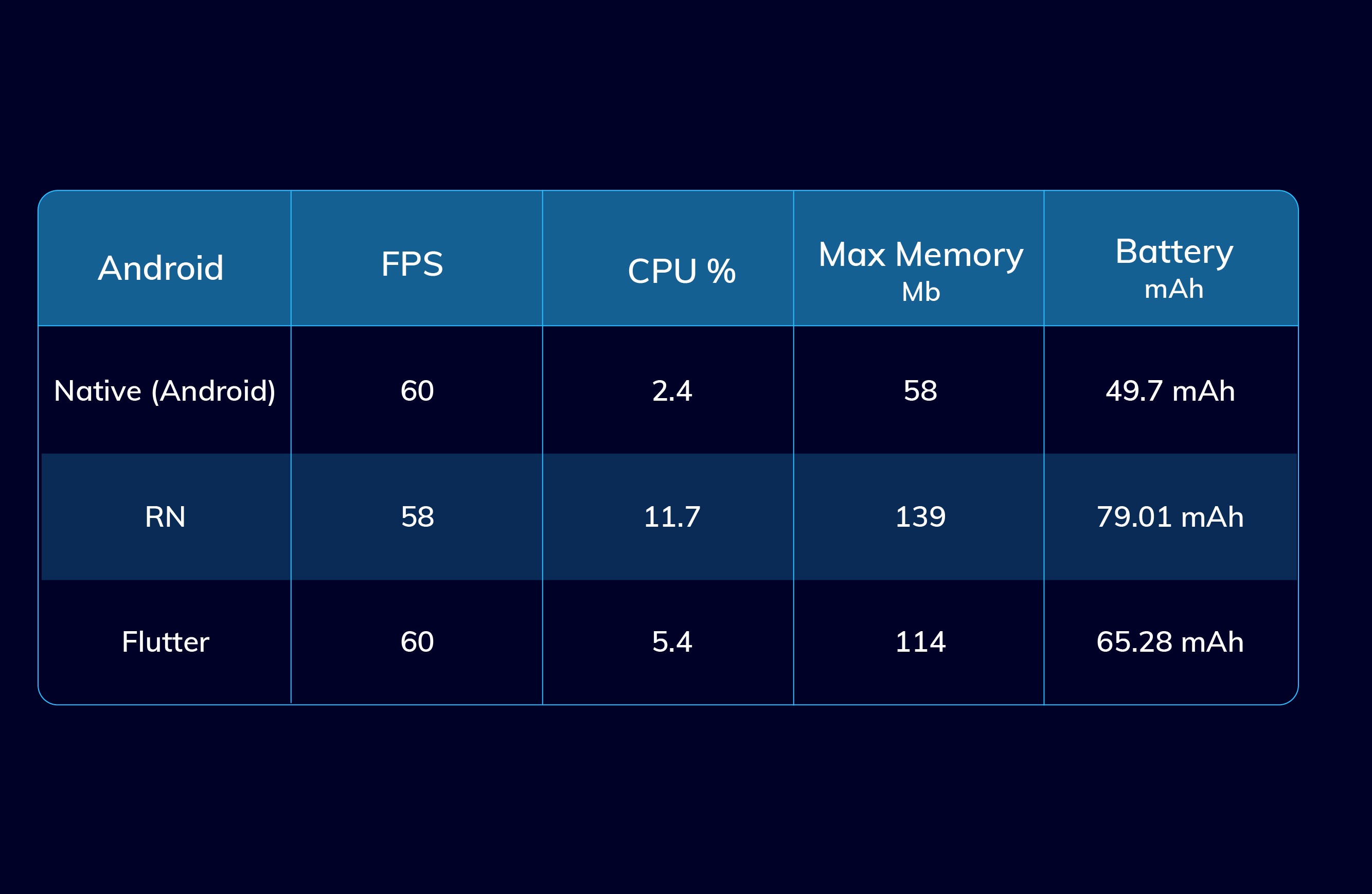 - 关于电池开发,Android Native具有最佳效果。 React-native落后于Android和Flutter。运行连续动画会在React Native上消耗更多电池电量。