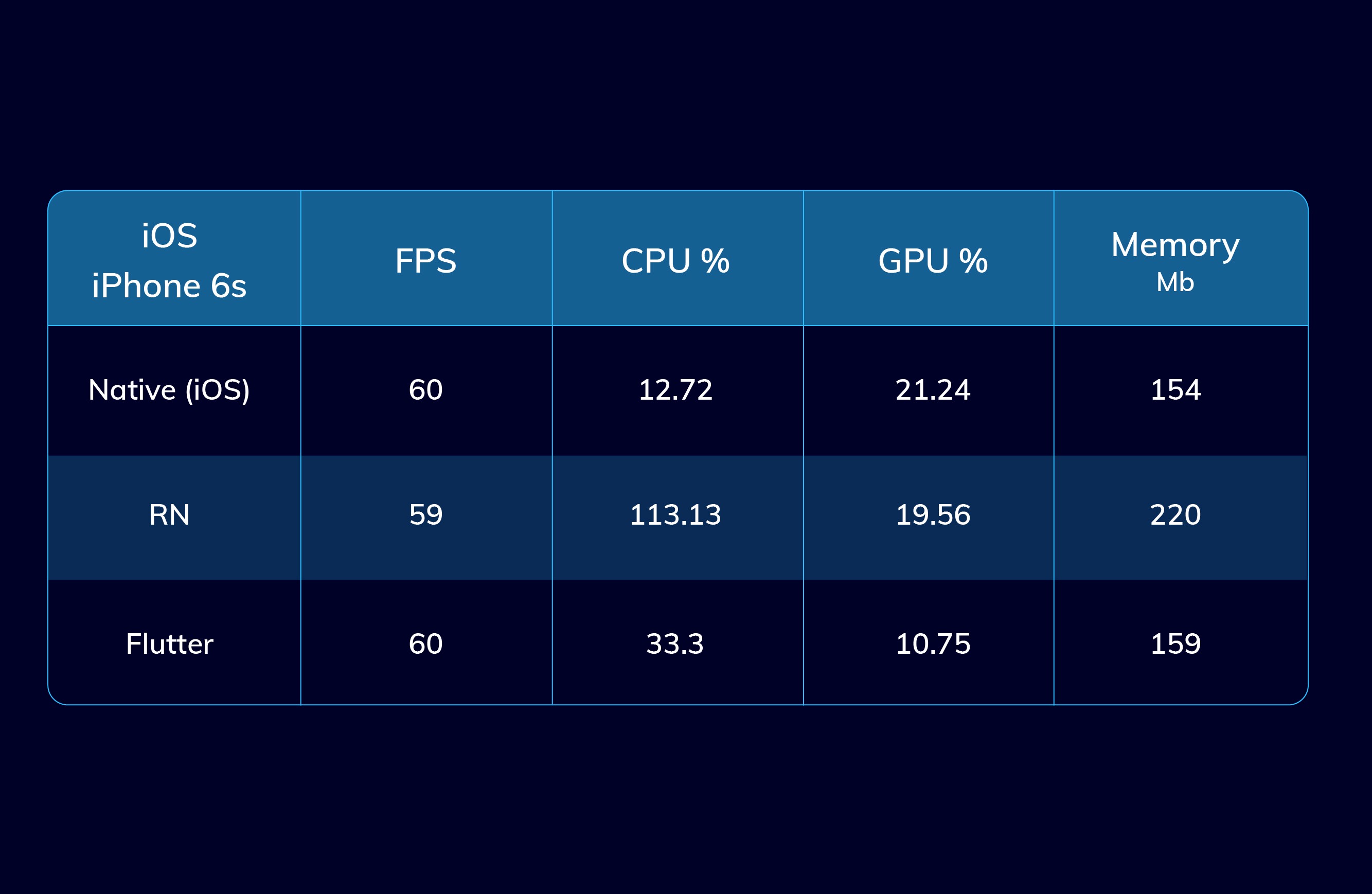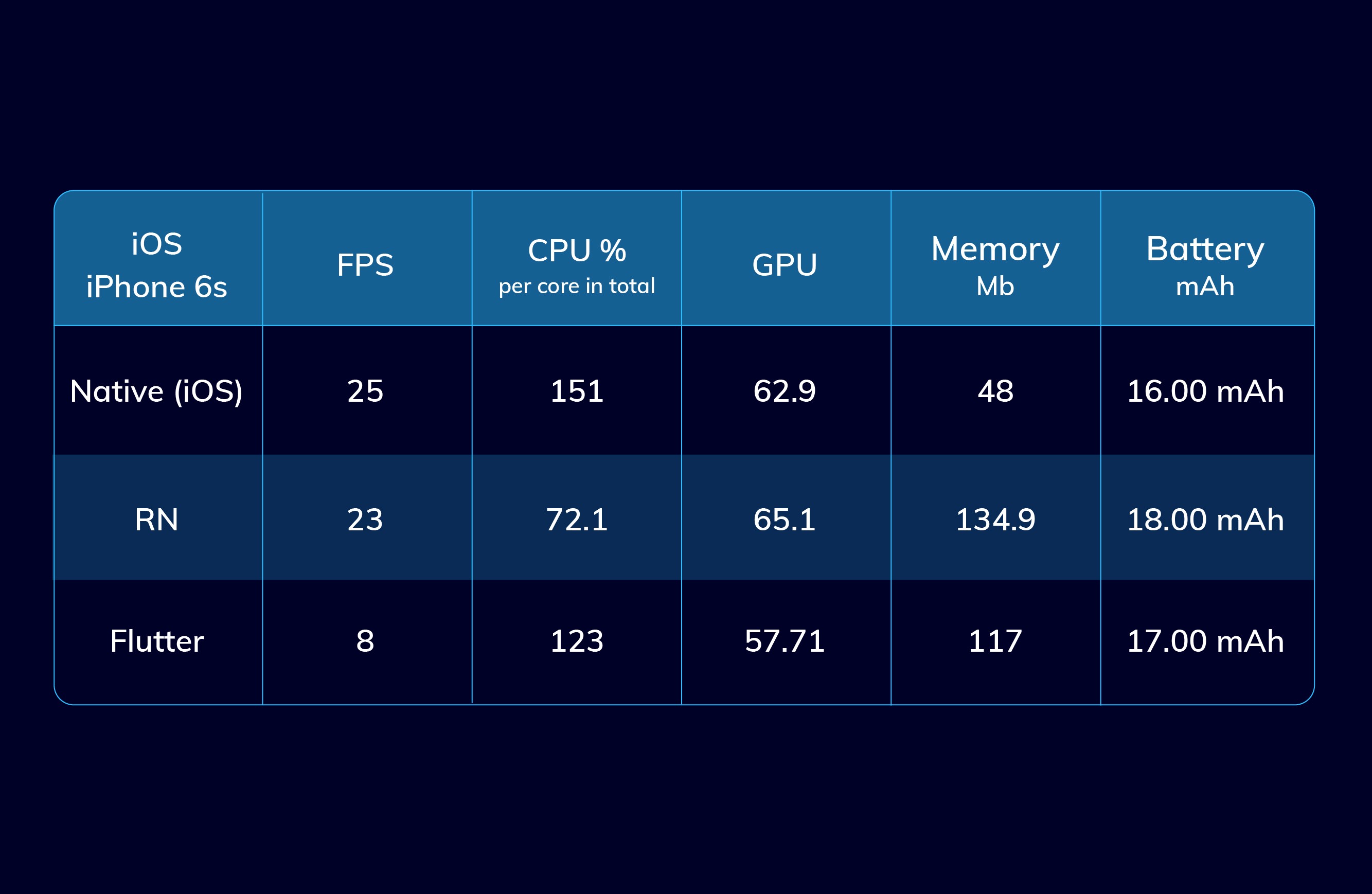 对于具有次要动画和闪亮外观的常规商务应用程序,技术根本不重要。但是,如果要制作一些繁重的动画,请记住,Native具有最强大的性能。接下来是Flutter和React Native。我们绝对不建议在CPU繁重的操作中使用React Native,而Flutter从CPU和内存的角度来看都非常适合此类任务。