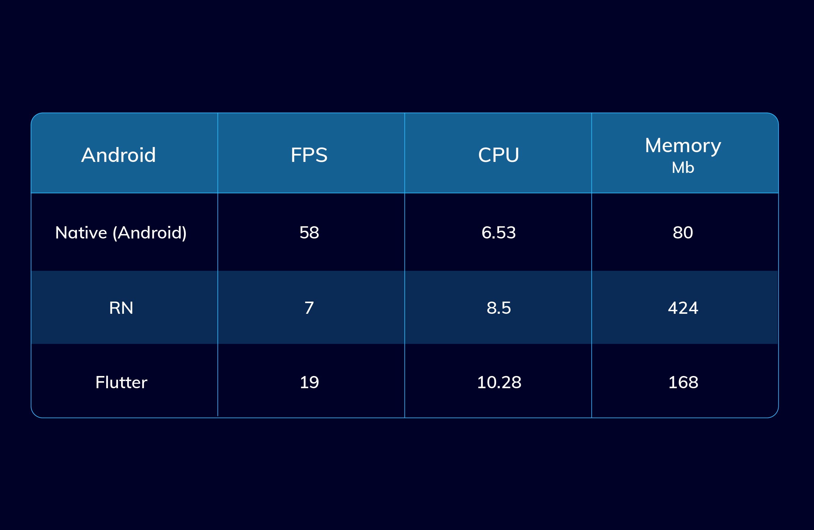 如今,大多数在Android和iOS上运行的手机都具有强大的硬件。在大多数情况下,使用常规的商业应用程序时,不会发现fps下降。因此,我们决定对重型动画进行一些测试。重得足以导致fps下降。我们使用了在Android,iOS,React Native上使用Lottie进行动画处理的矢量动画,并在Flutter上使用了与Flare相同的动画。