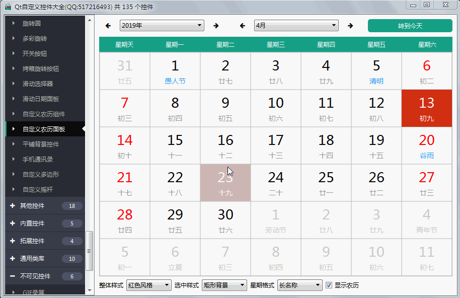 农历控件在国产linux中必备的控件之一,毕竟要适应国人的习惯,你看win10系统的日历,现在点开来直接就有农历在上面,非常方便人性化,所以在很多用Qt做的项目中,也有农历控件的应用场景,而Qt自带的日历控件比较简单,仔细看过源码的人也只知道,其实就是一堆微调框,下拉框,表格组成的,于是打算借用此方法造一个农历控件,本控件的算法是倪大侠提供的,个人测试下来还是没有问题的,造这个农历控件最大的难点是如何根据日期计算农历时间,再加上一些农历的节气之类的,这个网上估计也有很多的算法参考。