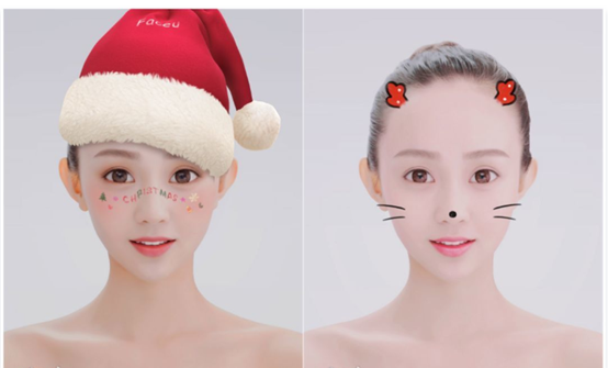 这两张效果图中, 我们可以看到一些可爱的圣诞帽贴纸和小鹿形象贴纸,在人脸区域,自动贴上不同的贴纸,便会生成很多有趣的特效,这也是大家爱不释手的原因。