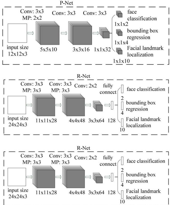 mtcnn的算法详解大家也可以在网络资源中自行学习,这里我们仅仅给出网络结构示意图,如图所示。