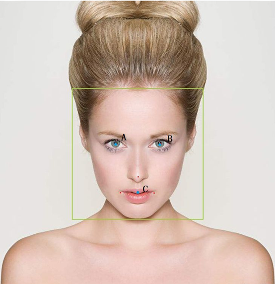 对于任意一张用户照片,先使用MTCNN得到人脸5个关键点,计算出人脸关键点A,B,C,我们记做A0,B0,C0;