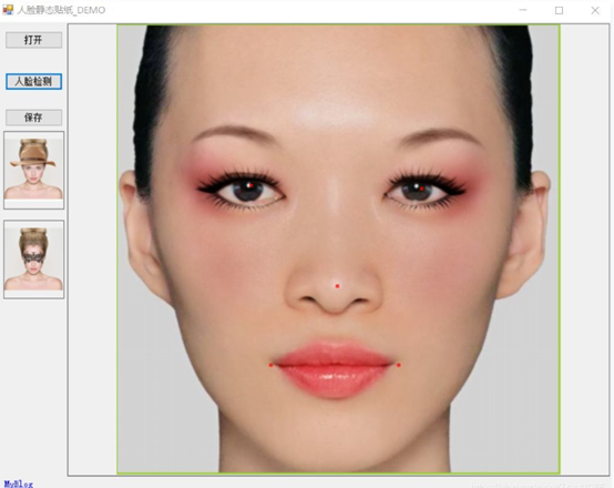所谓人像贴纸,第一步必然是人脸检测与关键点识别。在有人脸的情况下获取到必须的关键点,这样我们才能准确的打上贴纸。现有的app中,比如FaceU和轻颜相机,当然他们是一家的,他们的贴纸基本上都是数十个人脸特征点的模板配置,也就是说,完成一个贴纸效果,需要数十个点位信息的支持。不过,个人认为,最简单的贴纸,可以从三个点开始。
