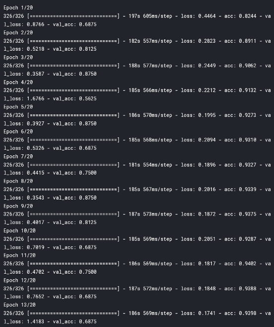 图像宽度和图像高度均为150像素。将有5217个样本需要训练,17个样本需要验证(稍后我们将通过数据增强添加更多)。验证数据是用于评估训练期间损失函数的数据(与测试数据相反,用于评估训练后的度量)。训练将分为20个epoch,每组16幅图像。