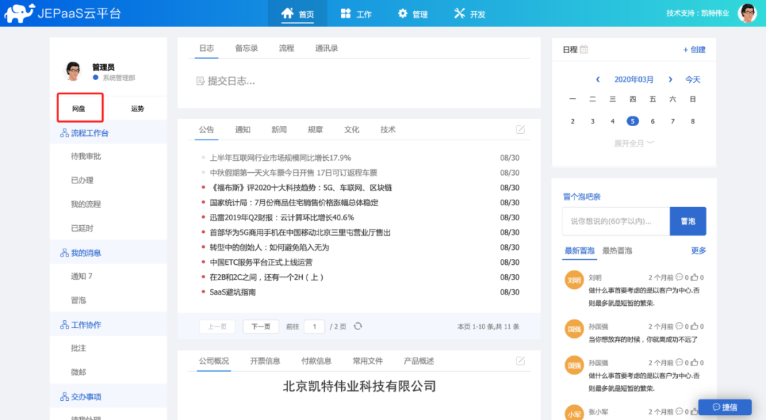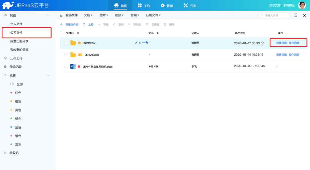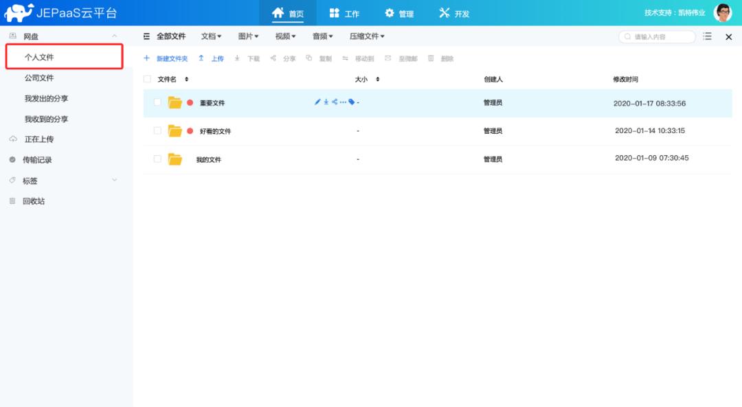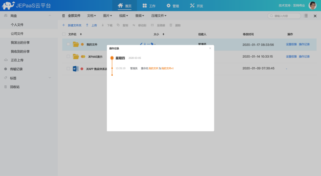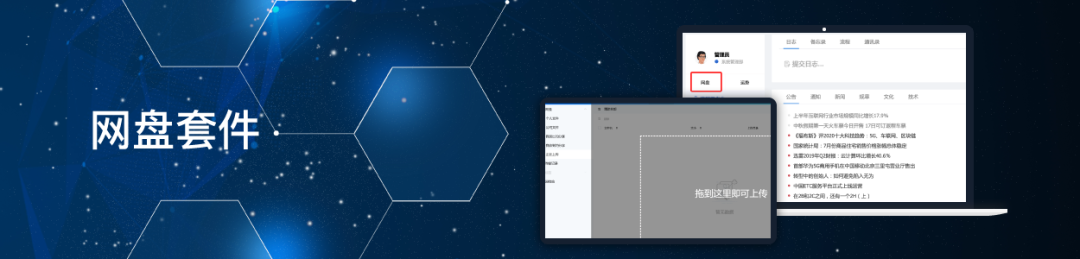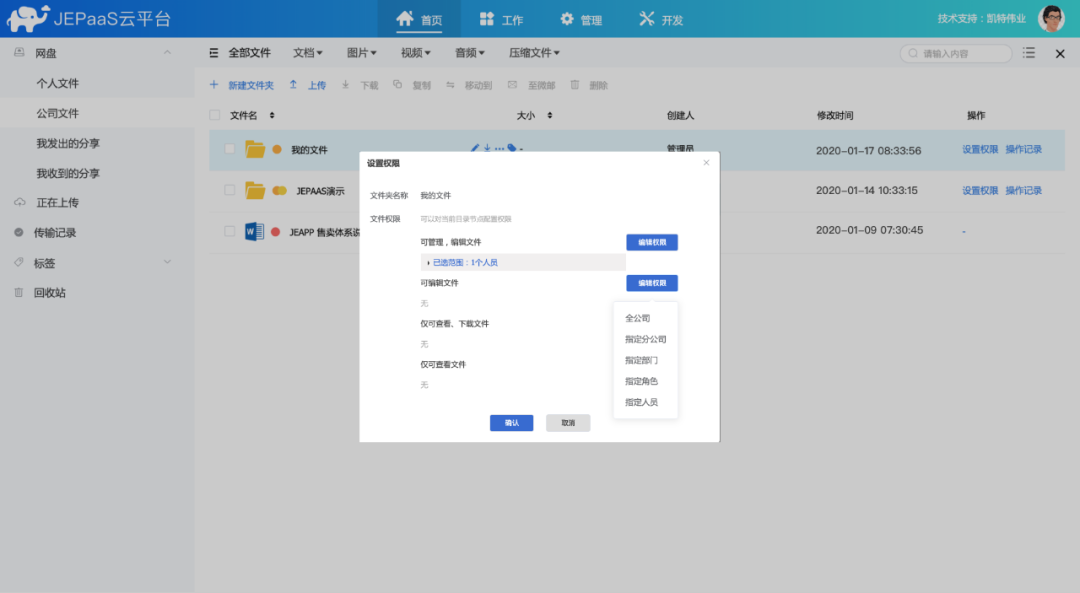 用户可以自由在网盘上传并存储个人或者公司文件;其中公司文件支持管理员角色授权等。