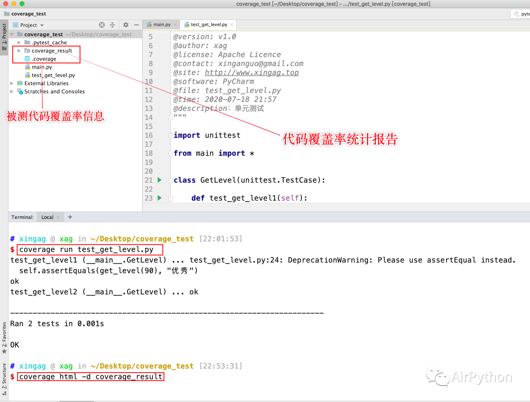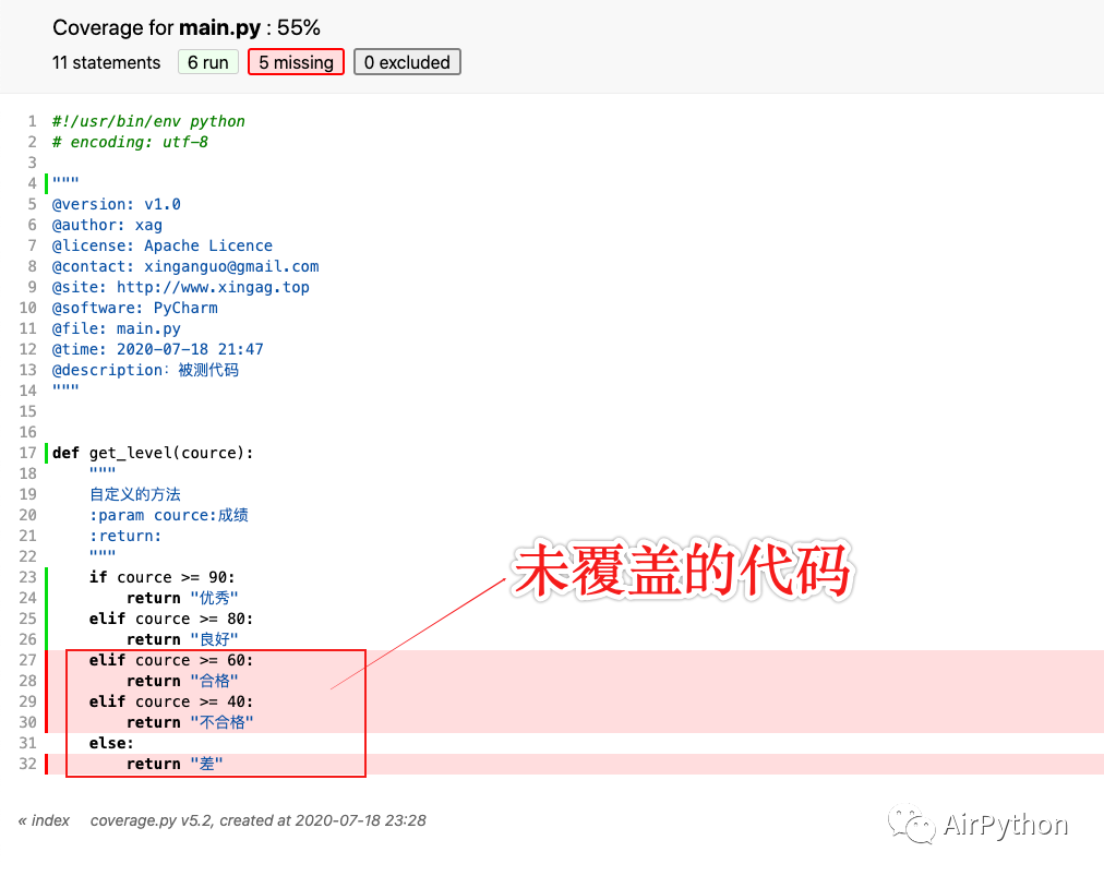 上面只是通过一个简单的 Python 方法结合 unittest 单元测试框架,展示了 Coverage 获取代码覆盖率统计报告的方法