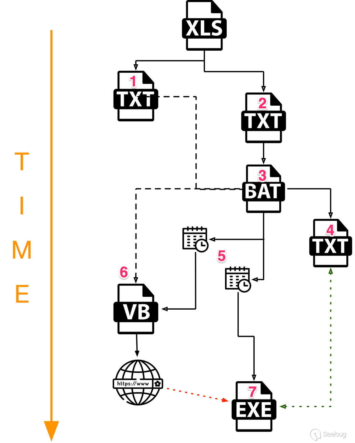 最后,XLS将两个文件写入磁盘,其中一个文件BAT立即修改一些系统设置并创建两个计划任务。然而,这种行为可能不足以确定为恶意组件。在20分钟之后,任务调度程序才会执行VBS downloader组件并启动BackConfig loader EXE,此时分析系统可能已经停止监视。