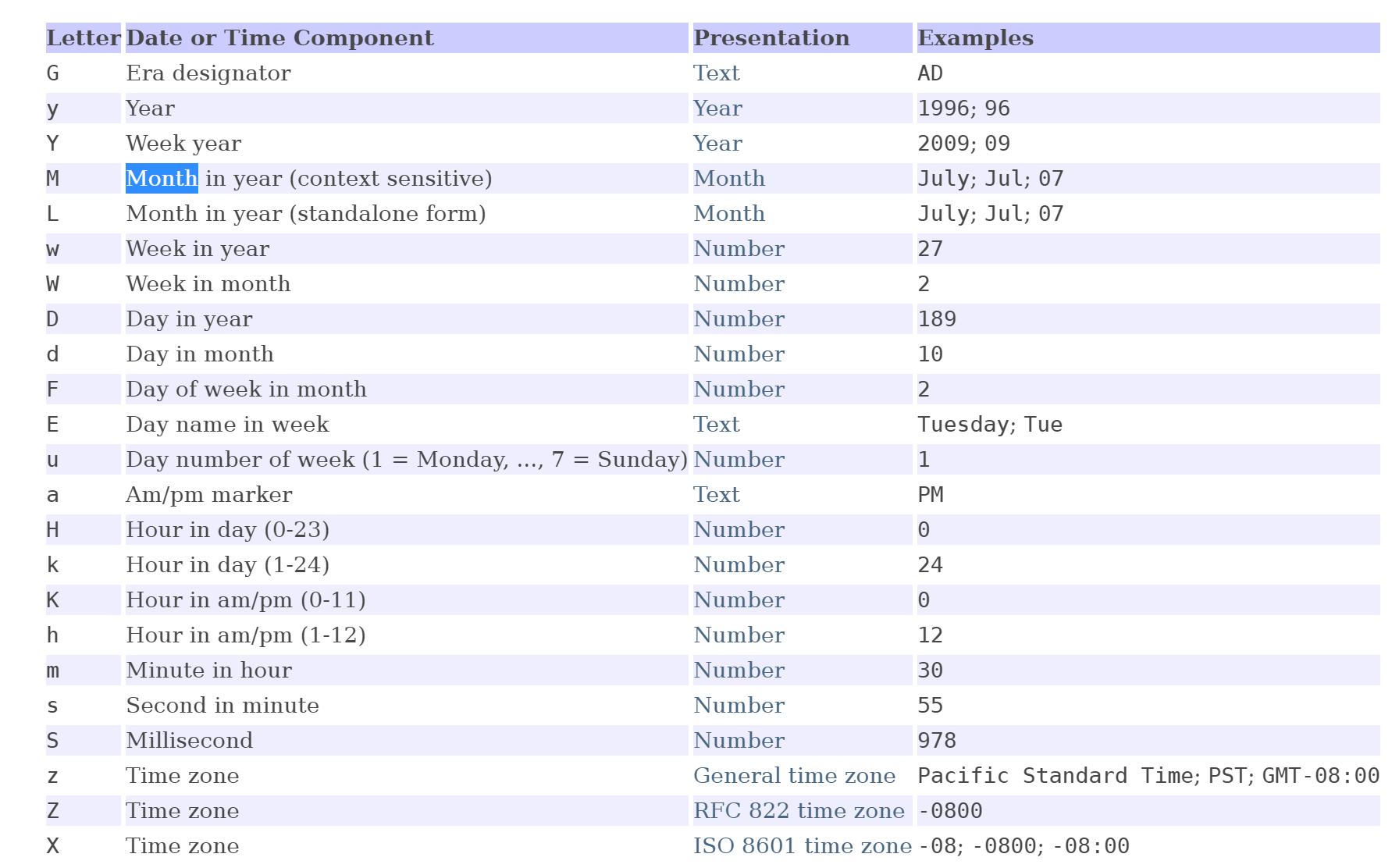 下面这张图表示了日期的模式,其中大写的M表示一年中的第几月,小写的m表示时分秒的分;大写的D是一年当中的第几天,小写的d是一个月中的第几天;大写的H表示Hour in day (0-23),小写的h Hour in am/pm (1-12);大写的S表示毫秒,小写的s表示秒,每个具体的含义可以参考下图: