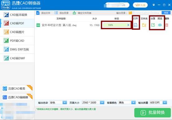 第三步:如下图,等待状态栏中会显示转换状态,显示100%时,表示文件转换成功,这时点击打开的图标即可(或分享或预览)。