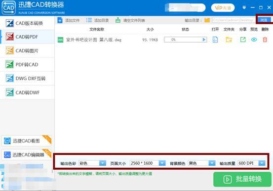 第二步:文件添加后,对下方的输出色彩、页面大小、背景压缩、输出质量选项进行自定义设置,随即在右上角修改输出目录的位置,最后点击右下角的“批量转换”。