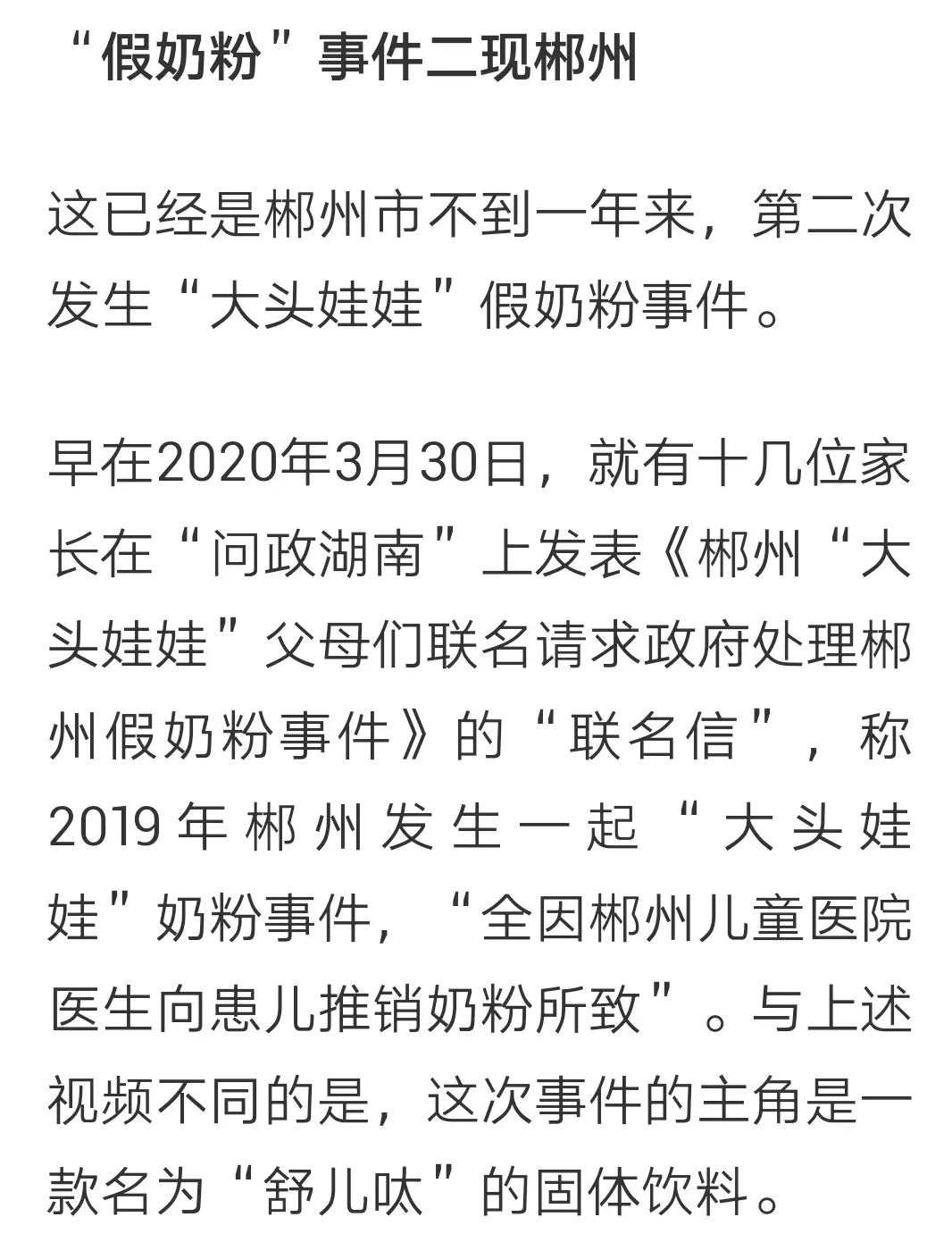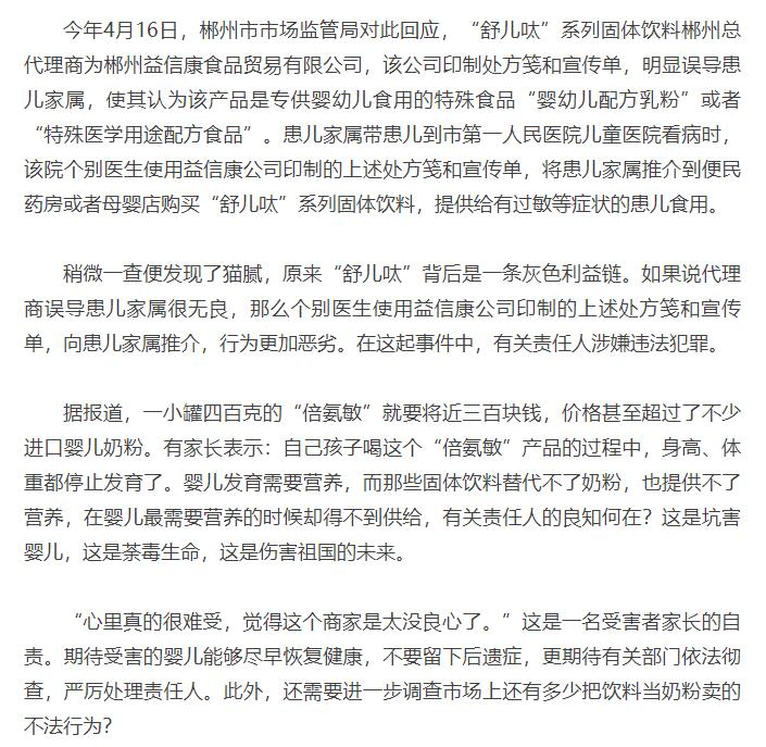 2、【郴州医生推荐假奶粉被停职 官方:虚假宣传退一赔三】5月13日,湖南郴州市市场监督管理局、卫健委回应南都记者关于郴州市儿童医院医生开处方推荐“假奶粉”事件的处理进展,事件定性为虚假宣传,已对涉事企业下达处罚决定书;企业将联合医院按退一赔三的方式向受害者家属赔偿,已安排患儿进行体检,涉事医生停职一年。多位患儿家属向记者表示,患儿体检是家属自费,部分家属和卫健委未就患儿的健康影响达成共识,后续治疗和营养费用未获赔偿。#????#