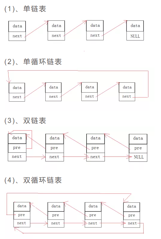 链表分为 4 种情况:单链表,单循环链表,双链表,双循环链表,一定要反复琢磨,理解清楚我下面画的模型,这些模型是本文核心所在;