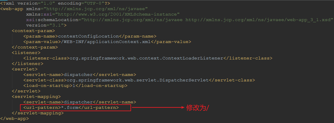 把<url-pattern>元素的值改为 / ,表示要拦截所有的请求,并交由Spring MVC的后台控制器来处理,改完之后: