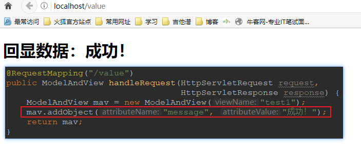 模型数据的是 message,内容是 “Hello Spring MVC”
