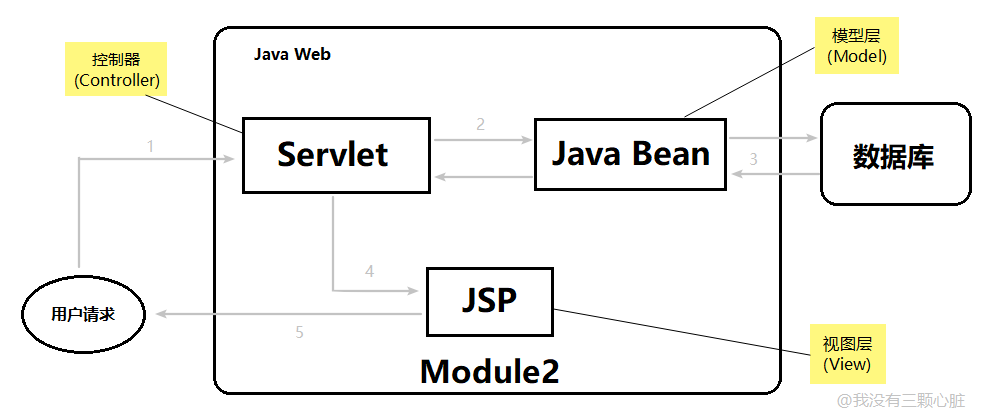 正因为上面的种种弊端,所以很快这种方式就被 Servlet + JSP + Java Bean 所替代了,早期的 MVC 模型(Model2)就像下图这样: