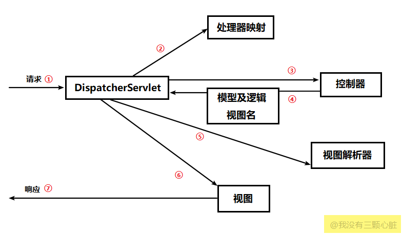 每当用户在 Web 浏览器中点击链接或者提交表单的时候,请求就开始工作了,像是邮递员一样,从离开浏览器开始到获取响应返回,它会经历很多站点,在每一个站点都会留下一些信息同时也会带上其他信息,下图为 Spring MVC 的请求流程: