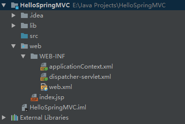 IDEA 会自动帮我们下载好必要的 jar 包,并且为我们创建好一些默认的目录和文件,创建好以后项目结构如下: