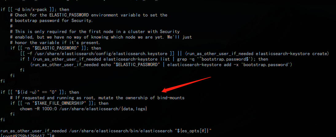 如果是root用户(docker启动容器,默认是以root用户身份),并且 TAKE_FILE_OWNERSHIP 变量存在,则将/usr/share/elasticsearch/{data,logs},这两个目录都改变为1000用户所属(这里也可以看到最终存储数据的路径为data,所以挂载时应该挂载到data下)。