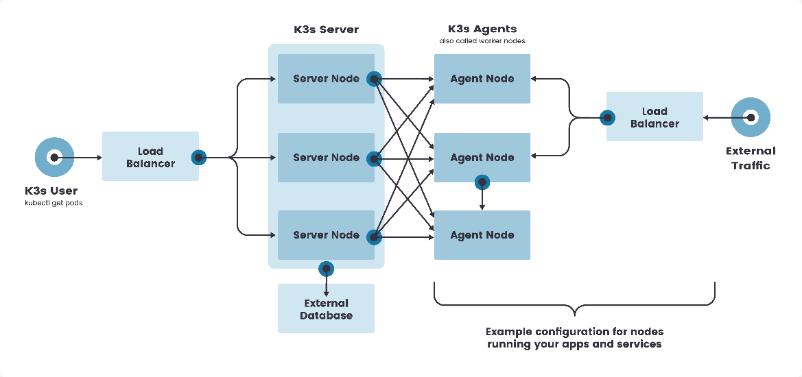 小型化的K3S内嵌轻量级数据库SQLite,也支持外挂数据库。K3S对于非OS的外部软件依赖也减到很低。如果辅以负载均衡节点 的话,K3S就可以实现高可用性的部署模式。