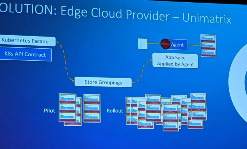 Target是美国一家著名的大型连锁超市。在2017年初,Target就开始用Kubernetes和Spinnaker自建Unimatrix平台,进行远程集群管理。Target采用舰队管理(Fleet Management)的模式,将含主从节点设备的整个集群部署到1850个门店中,每个集群由完全主从复用的三个节点设备组成,每个门店内的集群都是互相独立的。并在Unimatrix上支持Kubernetes API,以对接云端Kubernetes社区内丰富的应用生态。Unimatrix方案将Agent部署到门店,以对接Kubernetes集群和云的通信。