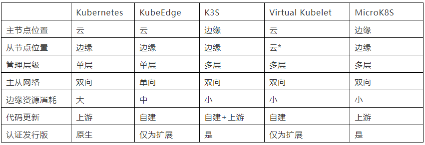 以上介绍了几种现在比较主流的将Kubernetes部署到边缘上的开源项目和技术方案。每种方案各有优缺点,列表对比如下: