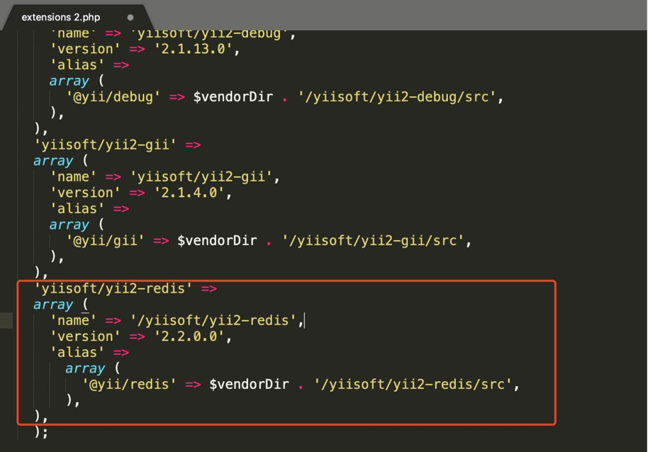 3、打开vendor/yiisoft下的extensions.php,添加如下代码