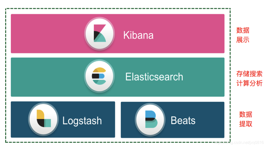 ELKB的架构分为三层:数据提取层、数据的存储层、数据展示层。ELKB将数据的提取、存储、展示做成套件,这是它比较优势的地方。