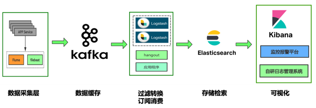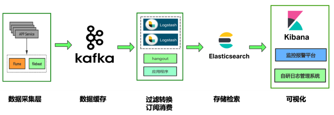 收集:在数据抓取层除了使用Flume之外,我们增加了Filebeat等套件。