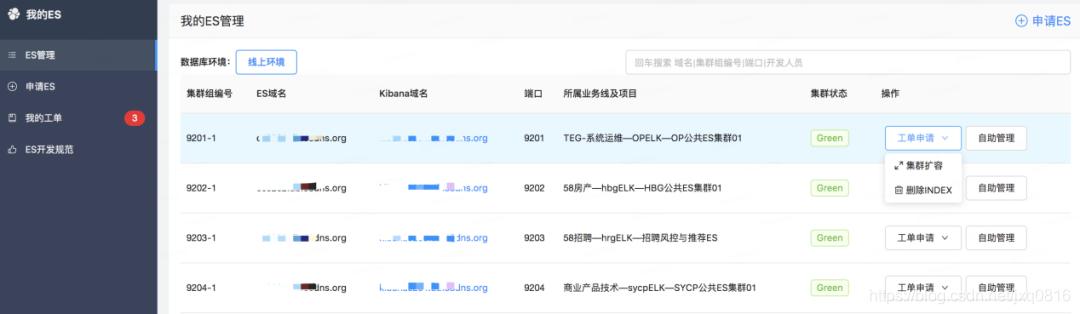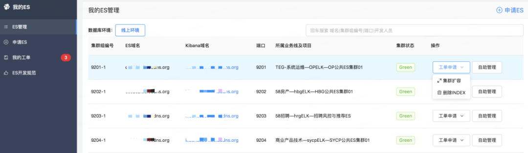 集群负责人可以从管理界面上看到自己名下的集群列表、Kibana地址、集群容量、操作申请等。