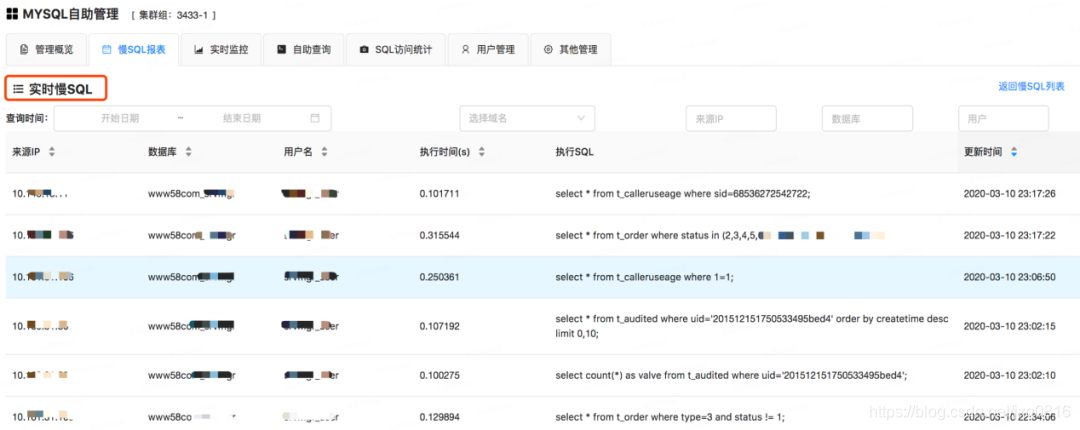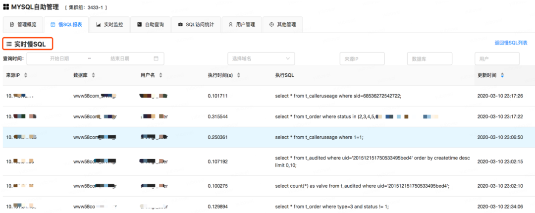 目前给开发人员提供的用户端,通过页面可以实时看到自己的MySQL,从收集到MySQL到展示,目前可以做到5秒以内展示。