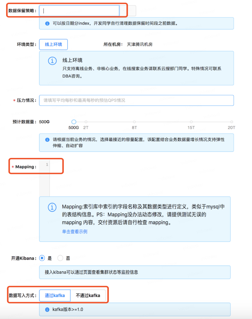 这个界面是索引申请界面。所有接入者通过标准化的方式、规范化的流程来完成需求提交。每一个索引的接入必须包括数据的保留策略、mapping、数据写入方式等。