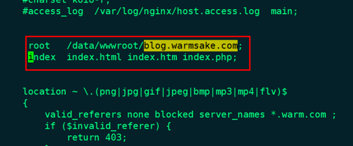 编辑虚拟主机配置文件/etc/nginx/conf.d/blog.warmsake.com.conf,添加以下一段内容
