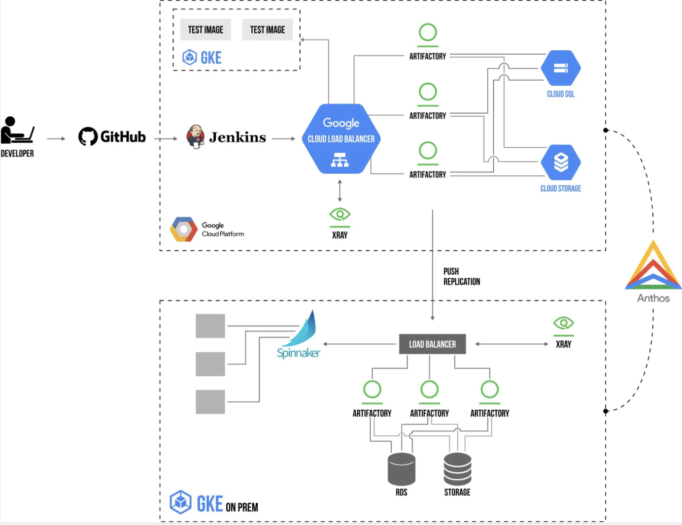 在这种混合架构中,来自不同产品团队的开发人员可以在Google Cloud Platform上构建其应用程序,并使用测试数据对其进行验证。GCP上的Artifactory在构建过程通过软件交付管道进行管理时,可对构建的受信任存储库进行管理,并通过XRay扫描会验证没有已知的安全漏洞,并且所有许可证都符合企业的合规性策略。