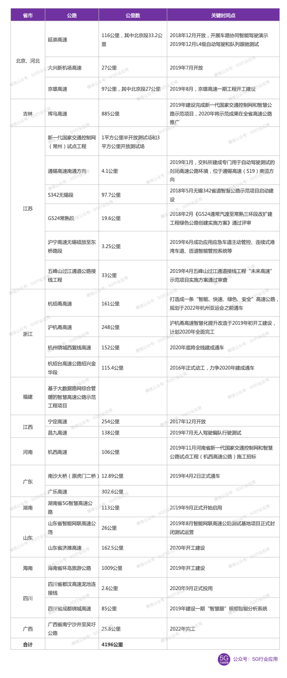 初步统计,全国高速公路车路协同创新示范预期长度超过4000公里,主要包括北京和河北的延崇高速、大兴新机场高速、京雄高速;吉林珲乌高速;江苏的新一代国家交通控制网(常州)试点工程、通锡高速南通方向、S342无锡段、G524常熟段、沪宁高速无锡硕放至东桥路段、五峰山过江通道公路接线工程;浙江的杭绍甬高速、沪杭甬高速公路智慧改造、杭州绕城西复线高速、杭绍台高速公路绍兴金华段;福建的基于大数据路网综合管理智慧高速公路示范工程项目;江西的宁定高速、昌九高速;河南的新一代国家交通控制网和智慧公路试点工程(机西高速公路);广东的南沙大桥、广乐高速;湖南的长沙113公里智慧高速项目;山东的智能网联高速公路测试基地项目、济潍高速;海南的环岛旅游公路;四川的都汶高速龙池连接线项目、成都绕城高速;广西的南宁沙井至吴圩公路等。