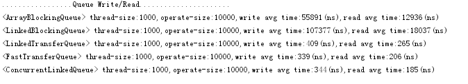 创建1000个线程,每个线程并往队列中写(offer)10000次和读10000次(poll),最后统计各线程的平均读写时间