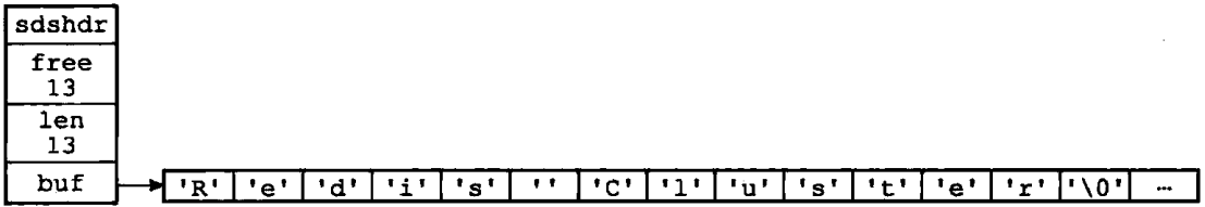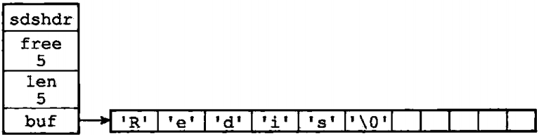 - buf属性是一个char类型的数组,数组的前五个字节分别保存了'R'、'e'、'd'、'i'、's'五个字符,而最后一个字节则保存空字符'\0',代表字符串结束