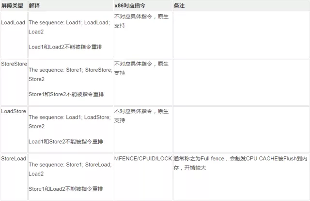 简而言之就是内存屏障限制死了屏障前后的内存操作顺序,抽象出来有四种内存屏障(因为内存 load/store 最多也就四种组合嘛),具体实现视不同的处理器而不同,我们这里看最常见的 x86 架构的处理器: