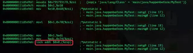 volatile 的 happens-before 原则其实就是依赖的 StoreLoad 内存屏障,重点关注 LOCK 指令实现,这和 volatile 的底层实现息息相关,查看下面代码片段对应的汇编代码: