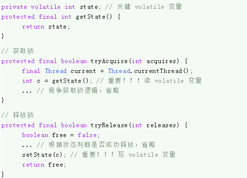 private volatile int state; // 关键 volatile 变量protected final int getState() { return state;}// 获取锁protected final boolean tryAcquire(int acquires) { final Thread current = Thread.currentThread(); int c = getState(); // 重要!!!读 volatile 变量 ... // 竞争获取锁逻辑,省略 }// 释放锁protected final boolean tryRelease(int releases) { boolean free = false; ... // 根据状态判断是否成功释放,省略 setState(c); // 重要!!!写 volatile 变量 return free;}