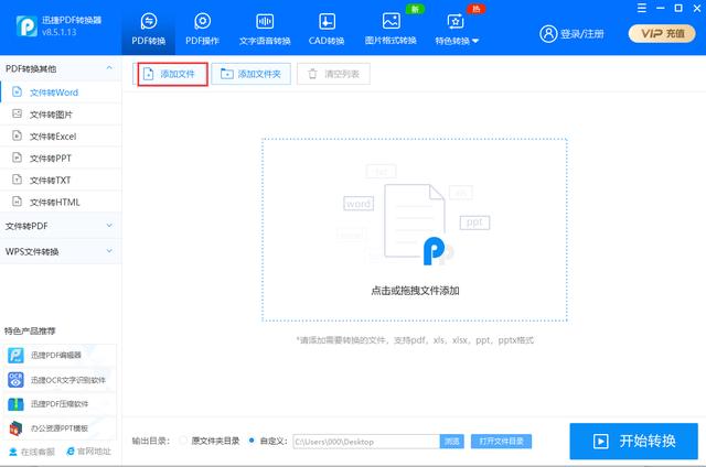 之后,点击右侧上方的“添加文件”,将需要转换格式的PDF文件给添加进来。
